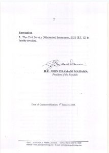 Au Ghana, le nouveau président veut réduire le train de vie de l’Etat. L’une des premières actions menées par John Dramani Mahama, est la réduction du nombre de ministères par décret. Les portefeuilles passent de 30 à 23. Ci-dessous, le décret.