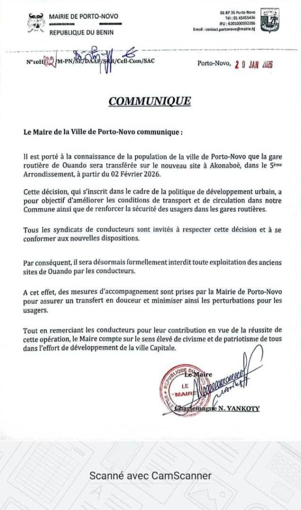A Porto-Novo, la gare routière de Ouando sera transférée sur le nouveau site à Akonaboè dans le 5e arrondissement. Les syndicats de conducteurs et les usagers ont été informés par le maire Charlemagne Yankoty à travers un communiqué en date du 29 janvier 2026. Dans ce cadre, informe la mairie, des mesures d’accompagnement sont prises pour assurer un transfert en douceur et minimiser les perturbations pour les usagers.